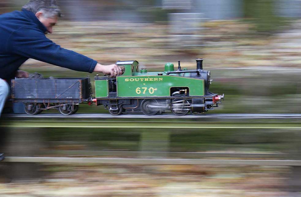 One of my favourite pictures from this year. Steve quite often takes an engine from the workshop off home with him at the weekend - he runs at his club on a Sunday afternoon, a video of the day's running usually ends up featured on his YouTube account by early Sunday evening, which must be some kind of record for high-speed video editing. This is the little Southern 0-4-2 tank that we had earlier in the year, Howard driving with some elan while Steve manned the camera.