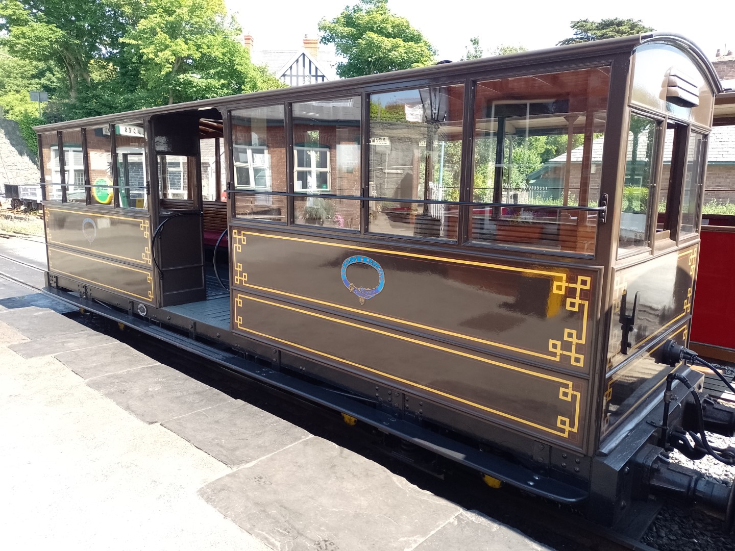 The ride up the line in a vintage First Class carriage was enjoyable, although the views are becoming somewhat obscured due to tree regrowth following their cutting back operation some years ago. As ever the tea shop at T-y-B provided satisfying fare, we sat in the sunshine and watched our engine, the double Fairlie "Merddin Emrys" run around ready for the return trip.