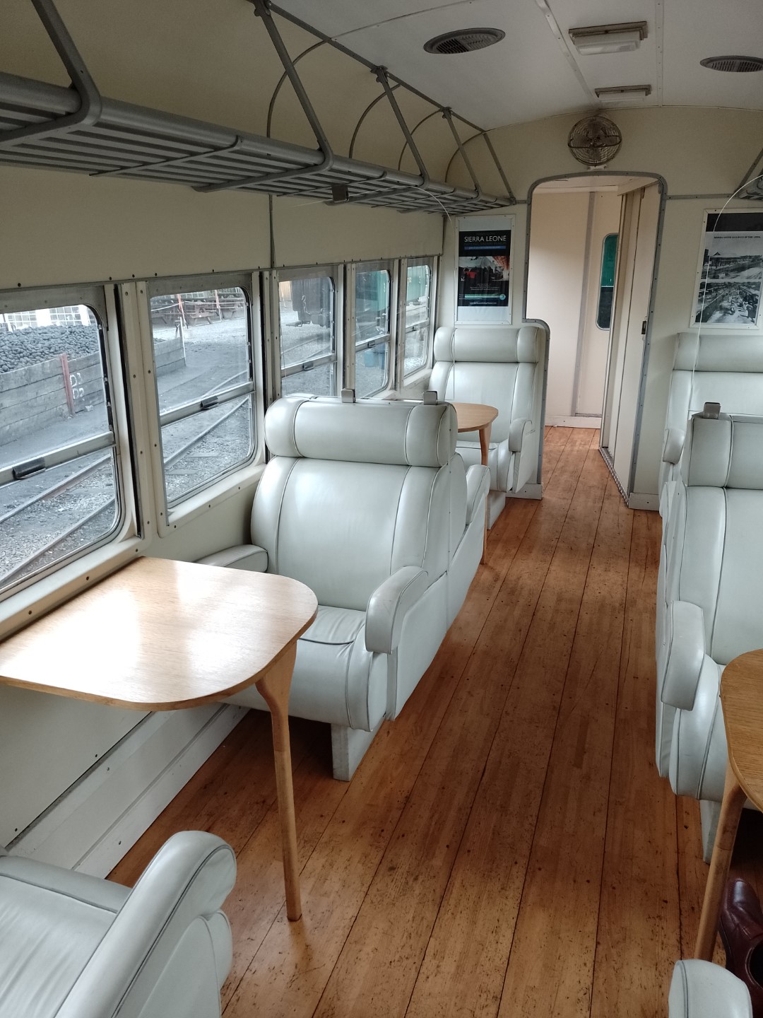 So - happily, James and I had a very comfortable ride to Welshpool in the utterly wonderful ex-Sierra Leone first class saloon. Built in 1961, from the outside it's a rather plain, slab-sided vehicle painted in drab green, looking like something which would have run on an Eastern European railway in the Cold War era. But, in complete contrast, inside it was furnished with fabulous Art Deco style armchairs upholstered in white leather, set on polished floorboards.
