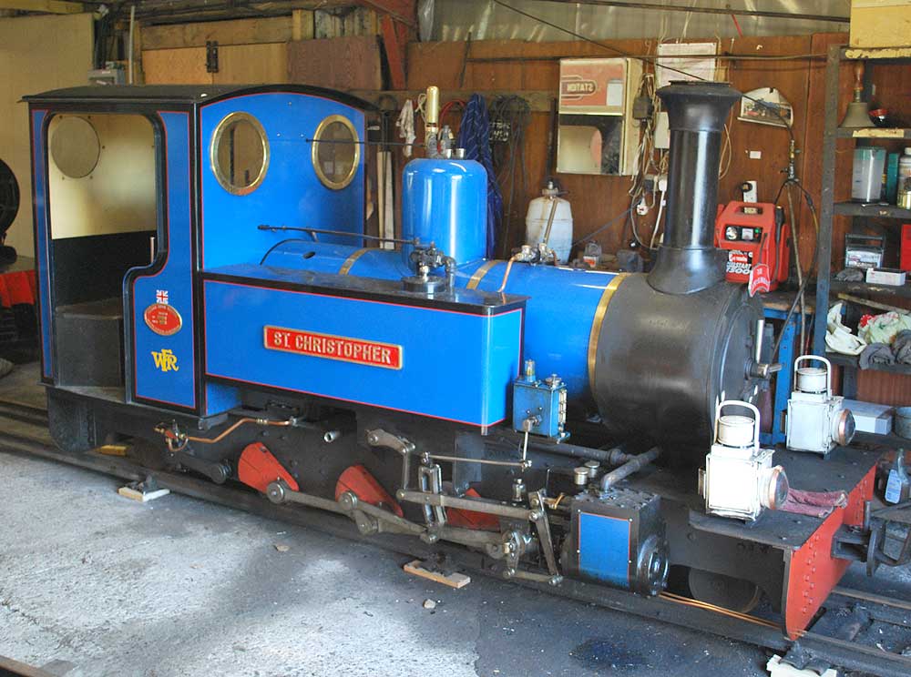 When not riding up and down the line, either in the train or on the engine, I spent several happy hours poking around the sheds. There is plenty to see - the sheds contain no less than four of the Barlow "A4" steam outline locomotives, "Bonny Dundee" from Ravenglass, the Class 20 Little Giant "Red Dragon" and a convincing looking battery-electric Black 5 - both built by Austin Moss - and "Katie", sister engine to "Sian", currently awaiting a new boiler. An Exmoor Steam 2-6-2 "St Christopher" is built to the same sort of scale as "Sian" and is in regular use each weekend.